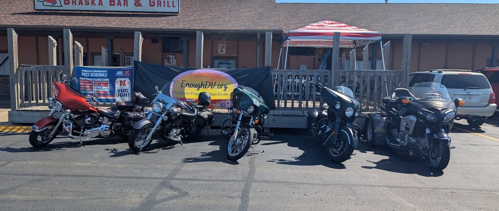 On Saturday, August 16, 2025 Enough DV organized their largest fundraiser to date with the support of over a dozen volunteers. The poker run event was supported by small community businesses- Val Tavern-Valparaiso, NE , Dons Bar in David City, Good Ol Days Bar-Staplehurst, Bottler Rocket Brewing Company in Seward and ended in Lincoln at Braska Bar on West O Street. Reistration started at Tower's Frontier Harley DAvidson in Lincoln. Approximately 100 riders registered and supported Enupgh DV with their first annual poker run!